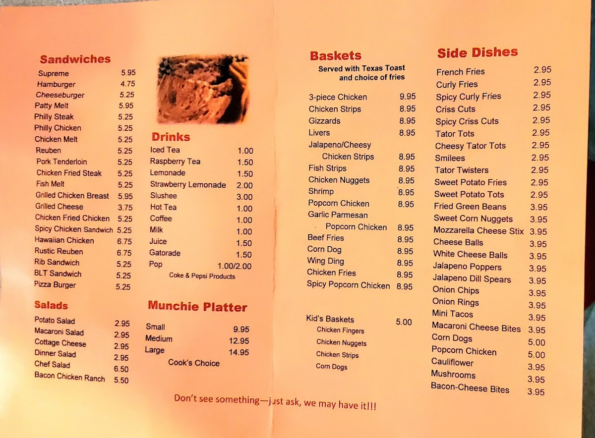 The menu boasts an impressive range of options, featuring hearty salads like the Chef Salad and Potato Salad, tantalizing basket items such as 3-Piece Chicken and Spicy Popcorn Chicken, and an array of delicious side dishes from crispy French Fries to loaded Cheese Balls.