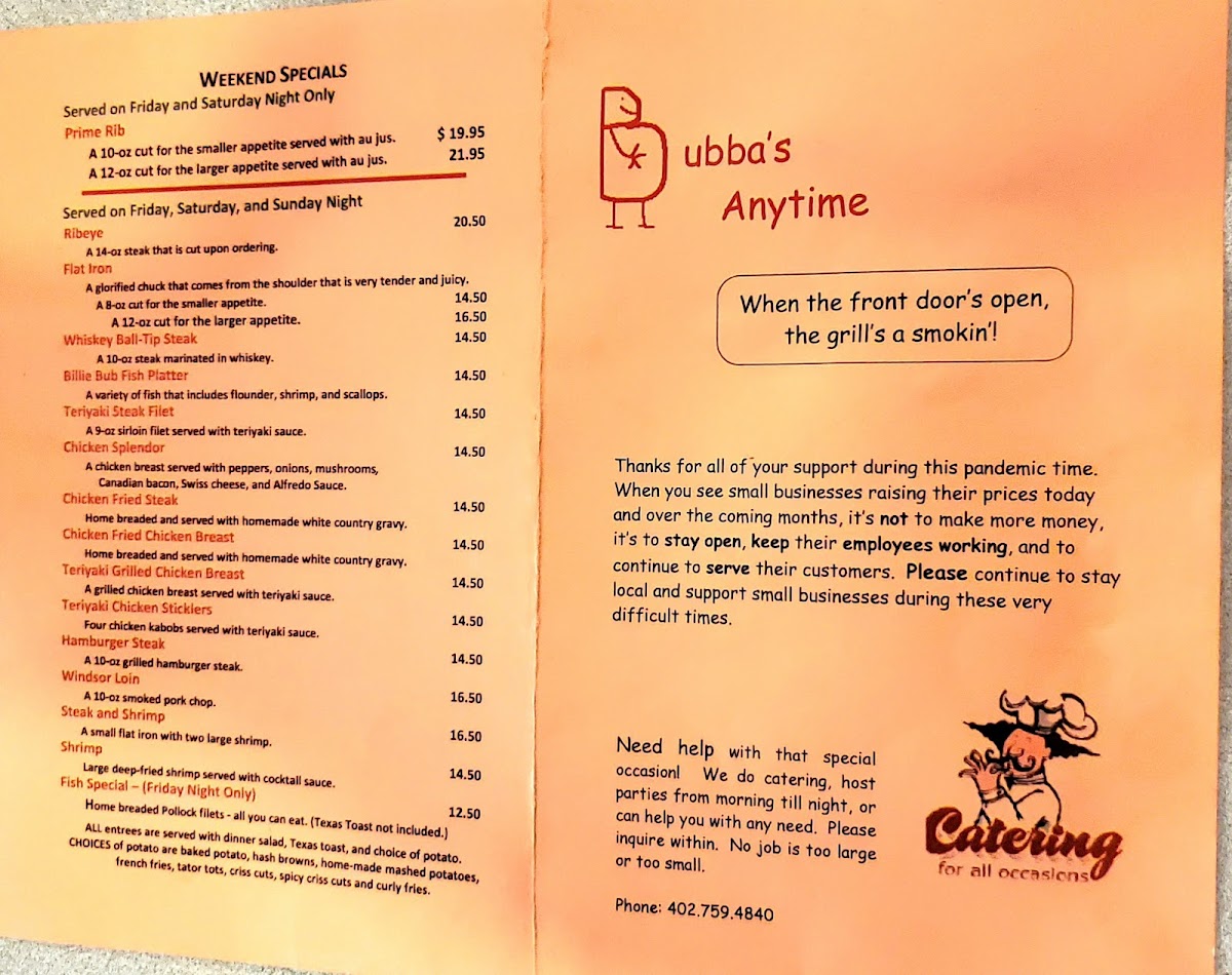 Welcome to Bubba’s Anytime, a charming eatery located at 313 Main St, Strang, NE, where great food meets a friendly atmosphere. This hidden treasure offers a diverse menu that caters to every palate, making it a perfect stop for any meal of the day.